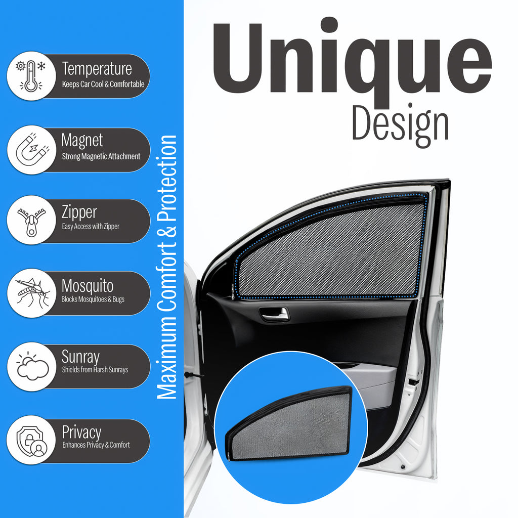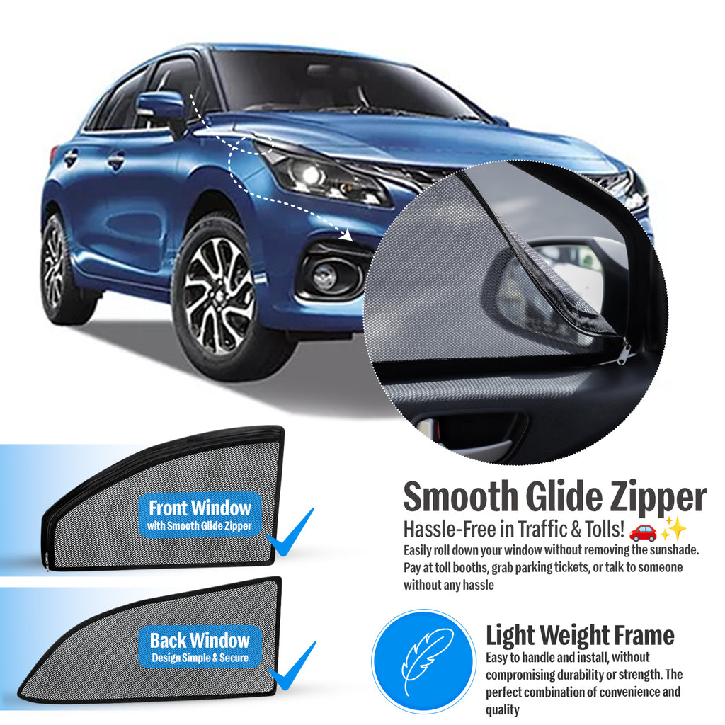 Upgrade your Maruti Baleno with Autofact’s premium magnetic sunshades, designed exclusively for New Generation Baleno models 2015-2025. These high-quality Black shades snap onto the metallic window frame instantly, keep your cabin cool, block harmful UV rays, and maintain clear side-mirror visibility. Front window shades include convenient zippers for quick access and fresh airflow