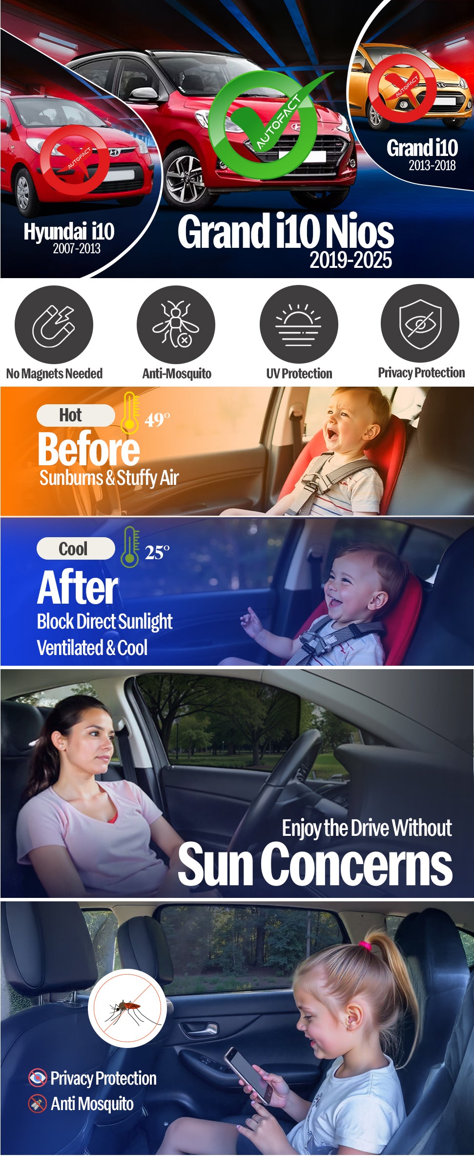 Give your Hyundai Grand i10 Nios the comfort and protection it deserves. Autofact custom-fit sunshades are engineered using advanced CAD CAM precision cutting, ensuring an exact factory-level fit for all Grand i10 Nios variants from 2019 to 2025. No loose fitting, no sagging — just clean, seamless coverage.
