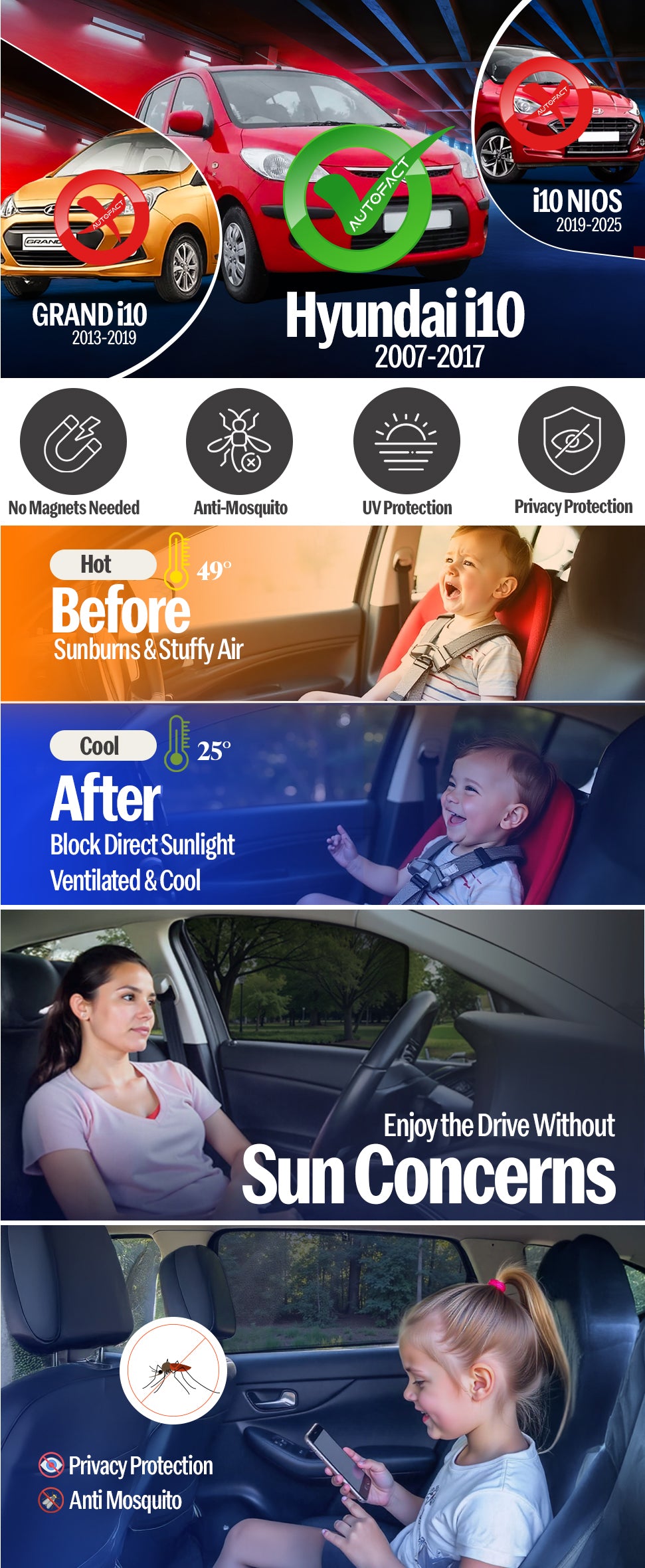 Give your Hyundai i10 the comfort and protection it deserves. Autofact custom-fit sunshades are engineered using advanced CAD CAM precision cutting, ensuring an exact factory-level fit for all i10 variants from 2007 to 2017. No loose fitting, no sagging — just clean, seamless coverage.