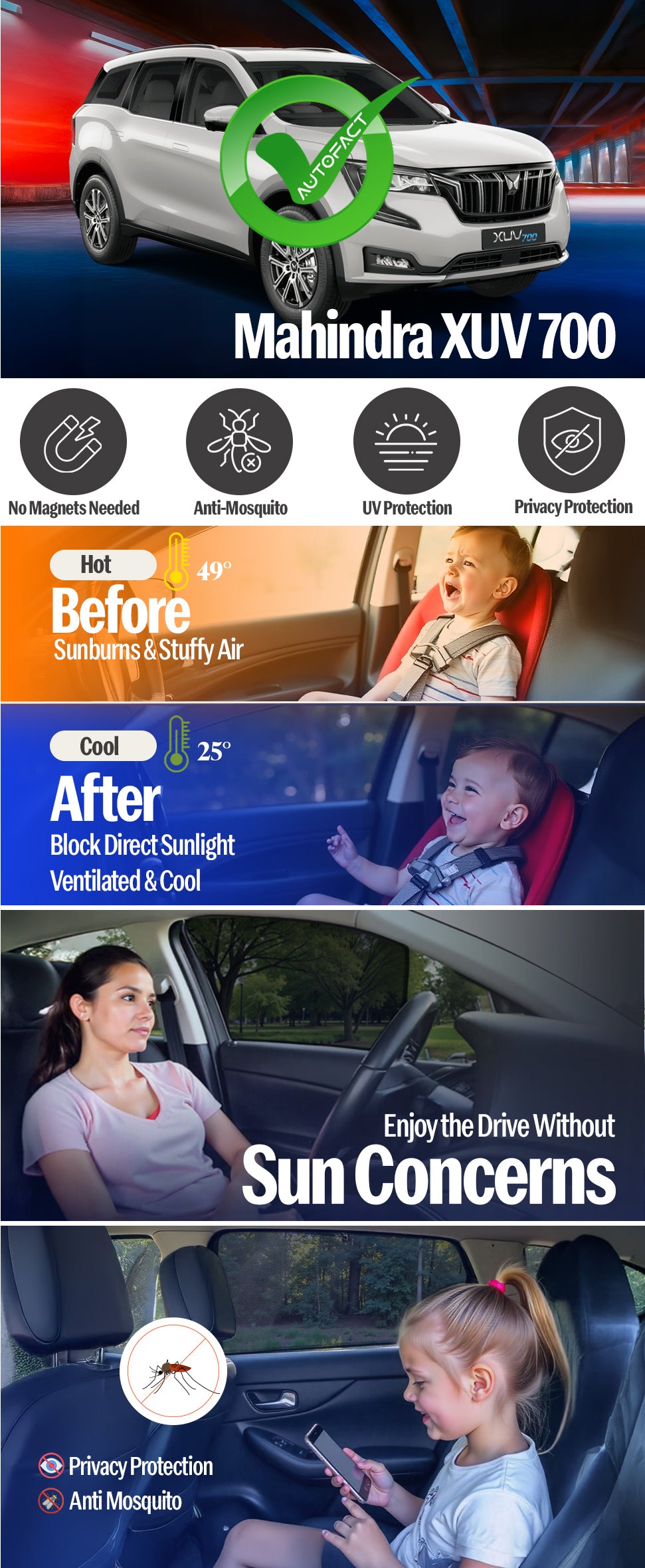 Give your Mahindra XUV 700 the comfort and protection it deserves. Autofact custom-fit sunshades are engineered using advanced CAD CAM precision cutting, ensuring an exact factory-level fit for XUV 700. No loose fitting, no sagging — just clean, seamless coverage.