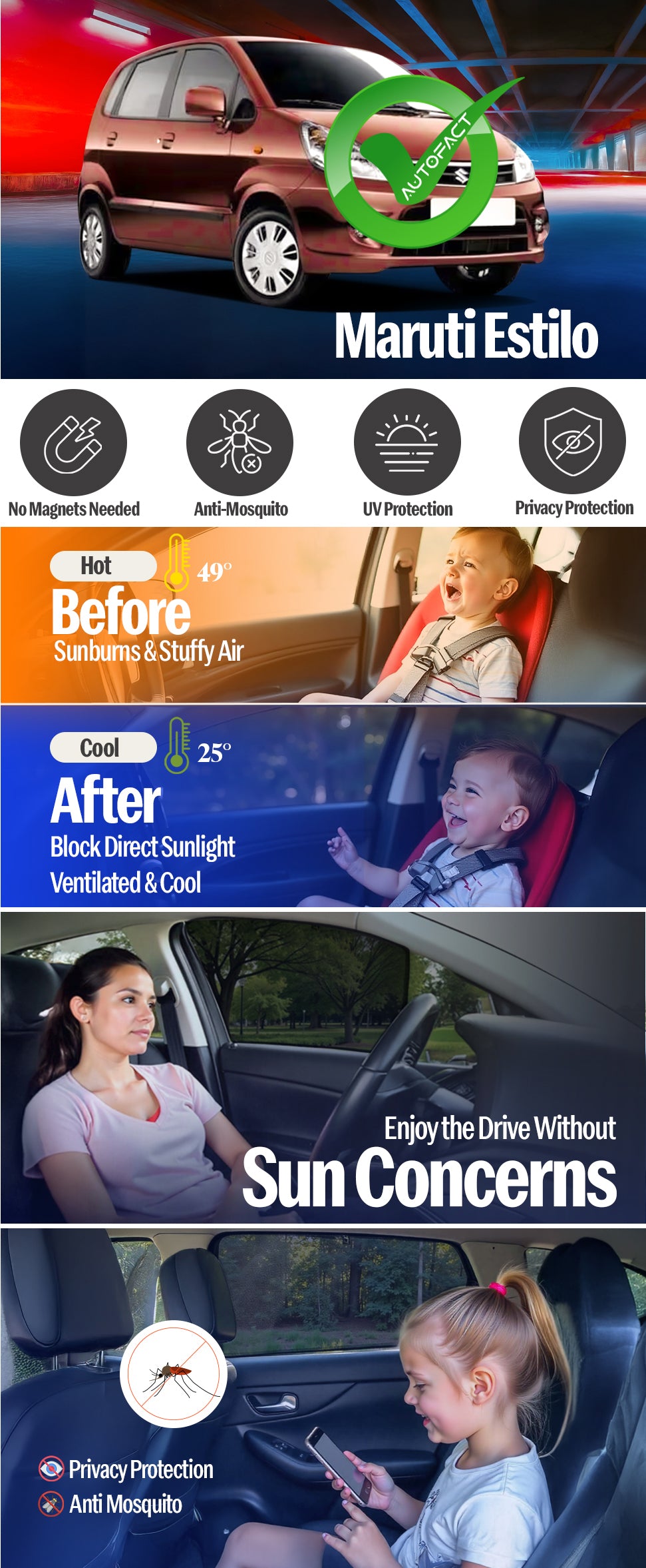 Give your Maruti Estilo the comfort and protection it deserves. Autofact custom-fit sunshades are engineered using advanced CAD CAM precision cutting, ensuring an exact factory-level fit for Estilo. No loose fitting, no sagging — just clean, seamless coverage.