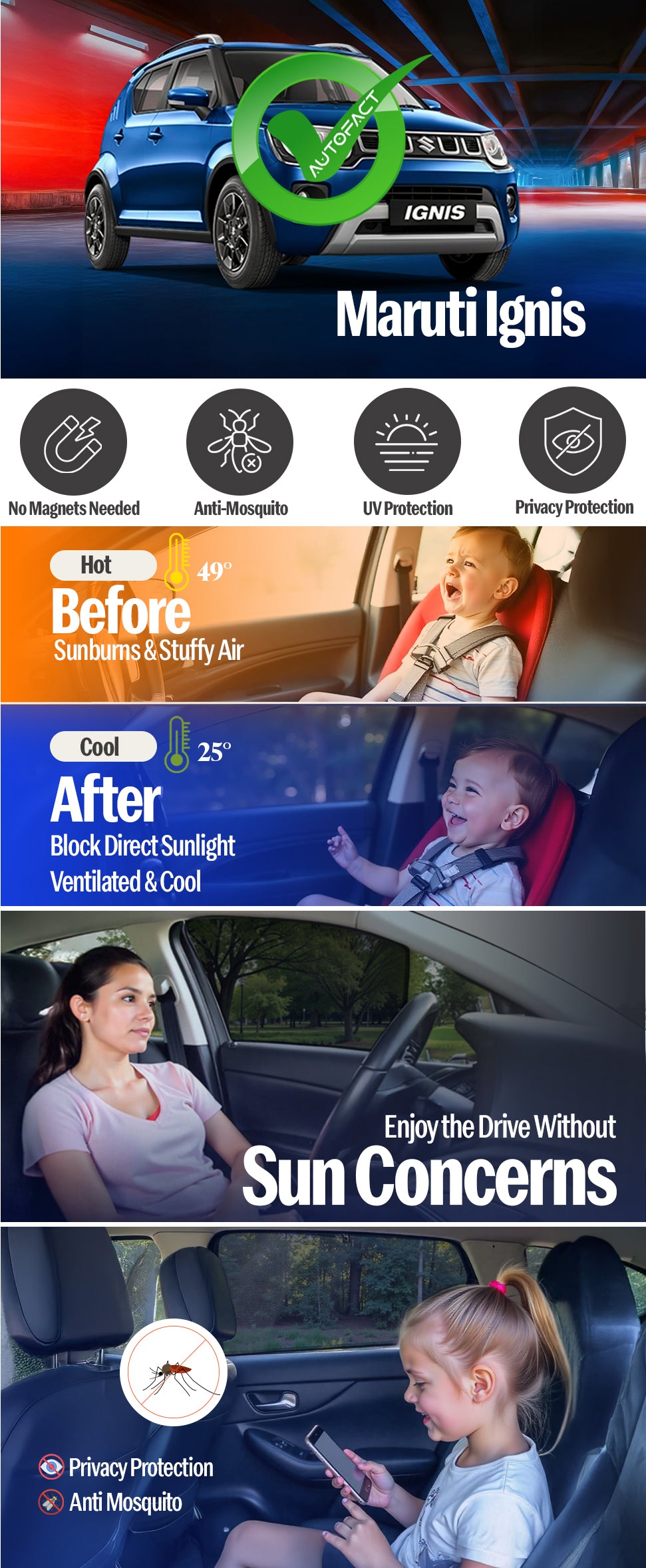 Give your Maruti Ignis the comfort and protection it deserves. Autofact custom-fit sunshades are engineered using advanced CAD CAM precision cutting, ensuring an exact factory-level fit for Ignis. No loose fitting, no sagging — just clean, seamless coverage.
