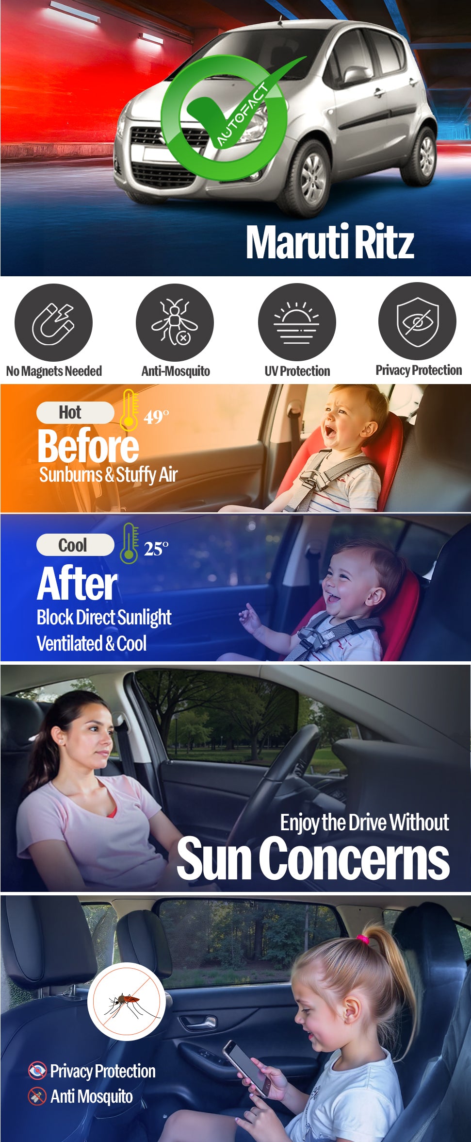 Give your Maruti Ritz the comfort and protection it deserves. Autofact custom-fit sunshades are engineered using advanced CAD CAM precision cutting, ensuring an exact factory-level fit for Ritz . No loose fitting, no sagging — just clean, seamless coverage.