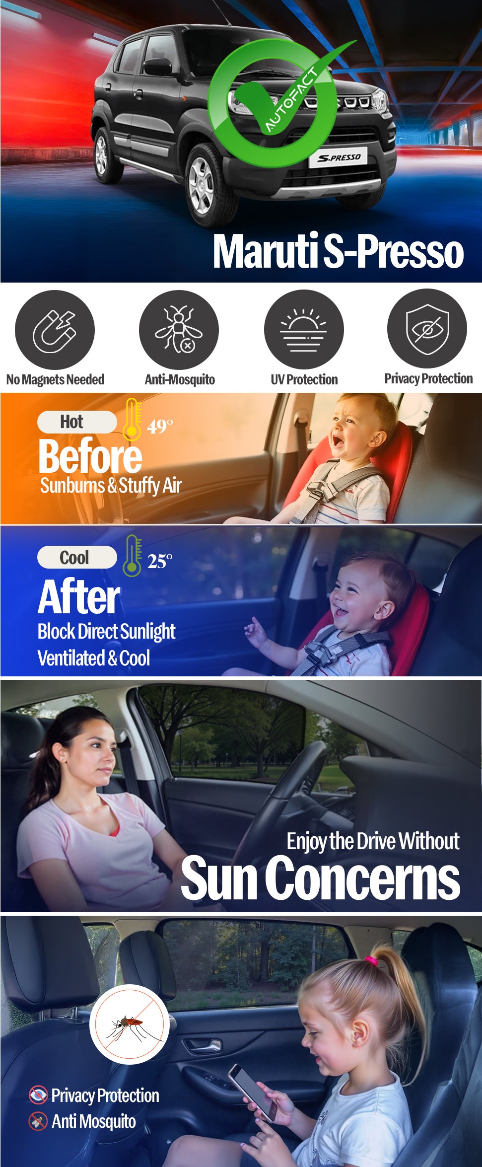 Give your Maruti Spresso the comfort and protection it deserves. Autofact custom-fit sunshades are engineered using advanced CAD CAM precision cutting, ensuring an exact factory-level fit for Spresso. No loose fitting, no sagging — just clean, seamless coverage.