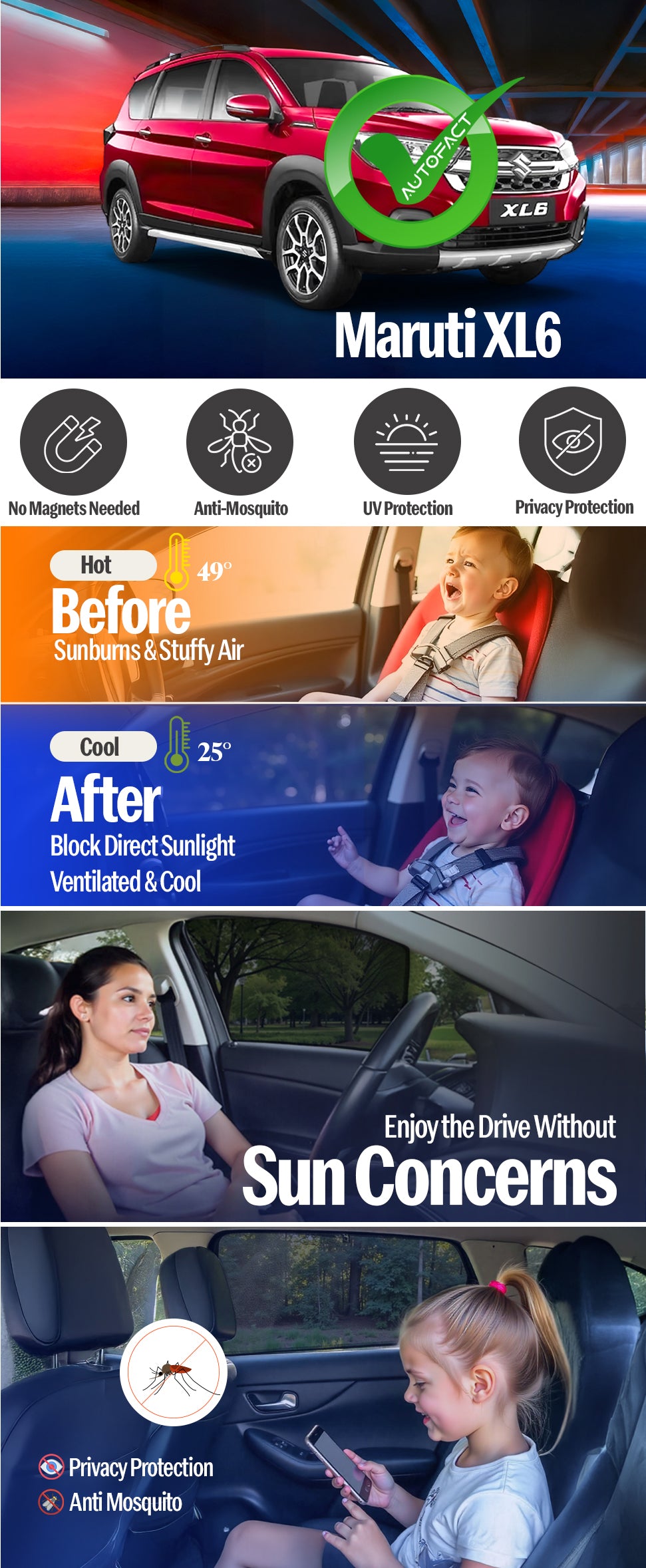 Give your Maruti XL6 the comfort and protection it deserves. Autofact custom-fit sunshades are engineered using advanced CAD CAM precision cutting, ensuring an exact factory-level fit for XL6. No loose fitting, no sagging — just clean, seamless coverage.