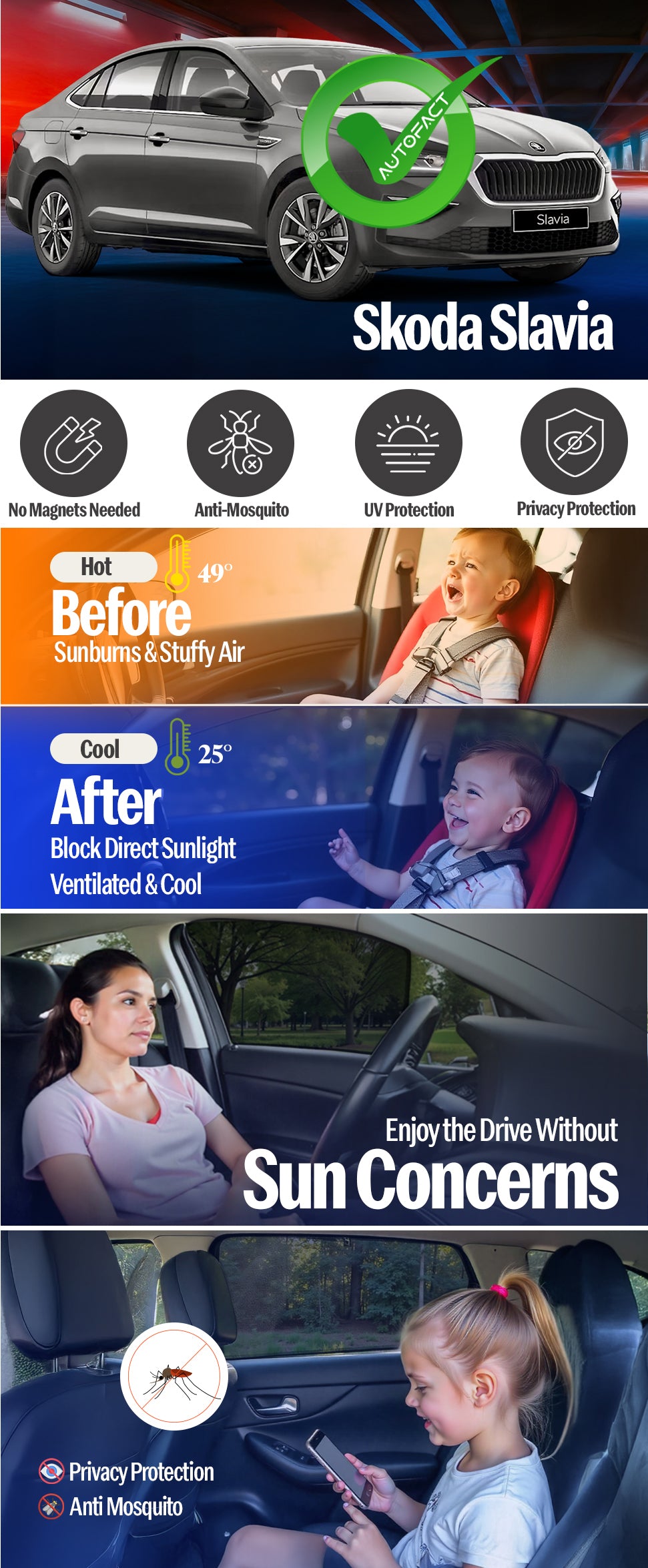 Give your Skoda Slavia the comfort and protection it deserves. Autofact custom-fit sunshades are engineered using advanced CAD CAM precision cutting, ensuring an exact factory-level fit for Slavia. No loose fitting, no sagging — just clean, seamless coverage.