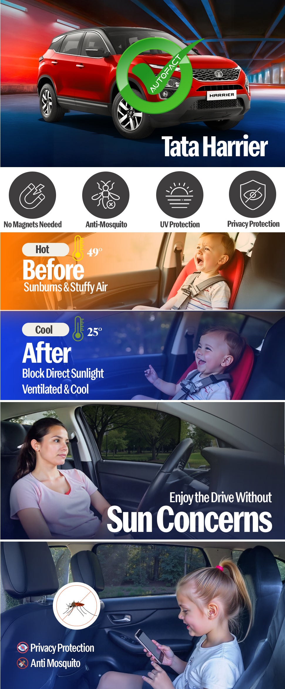 Give your Tata Harrier the comfort and protection it deserves. Autofact custom-fit sunshades are engineered using advanced CAD CAM precision cutting, ensuring an exact factory-level fit for Harrier. No loose fitting, no sagging — just clean, seamless coverage.