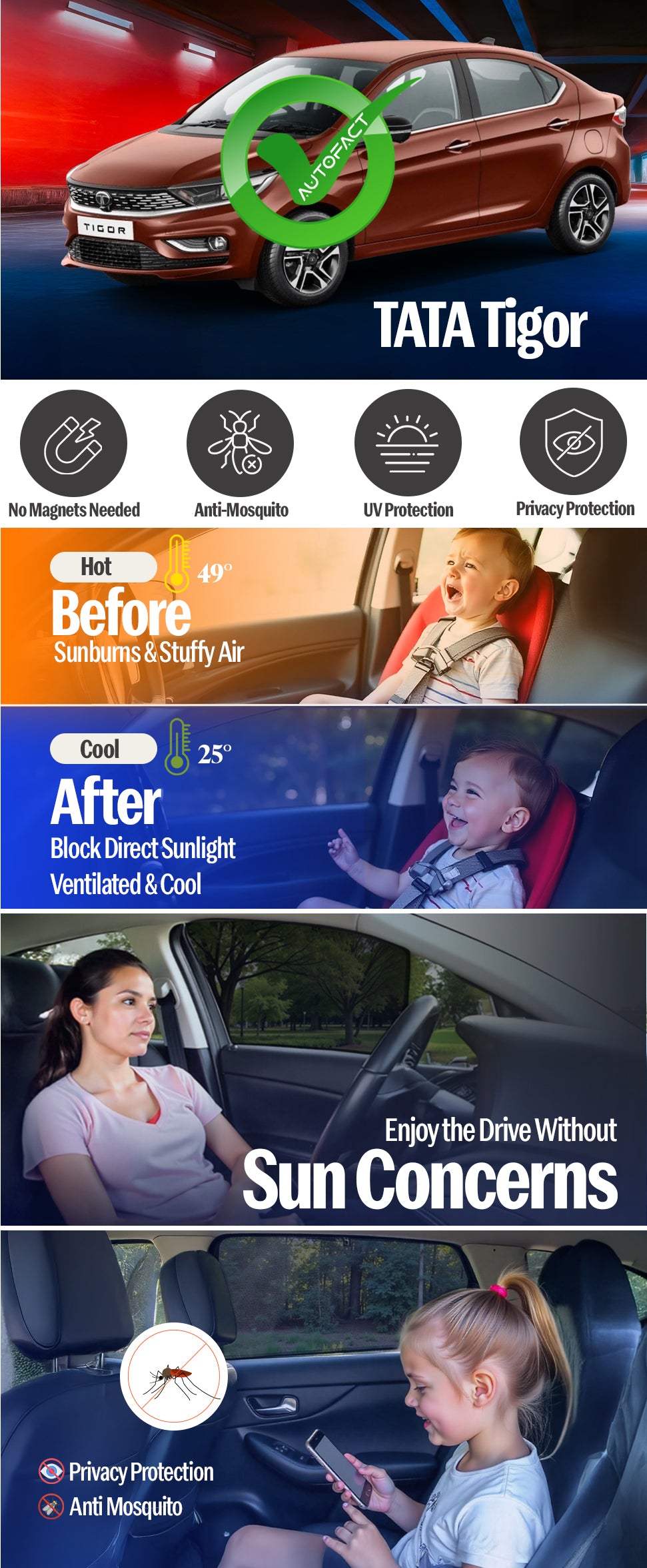 Give your Tata Tigor the comfort and protection it deserves. Autofact custom-fit sunshades are engineered using advanced CAD CAM precision cutting, ensuring an exact factory-level fit for Tigor. No loose fitting, no sagging — just clean, seamless coverage.