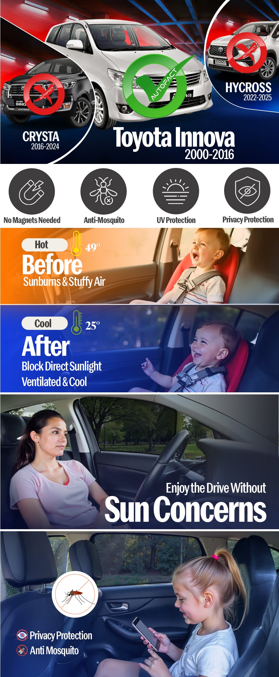 Give your Toyota Innova the comfort and protection it deserves. Autofact custom-fit sunshades are engineered using advanced CAD CAM precision cutting, ensuring an exact factory-level fit for all Innova variants from 2000 to 2016. No loose fitting, no sagging — just clean, seamless coverage.
