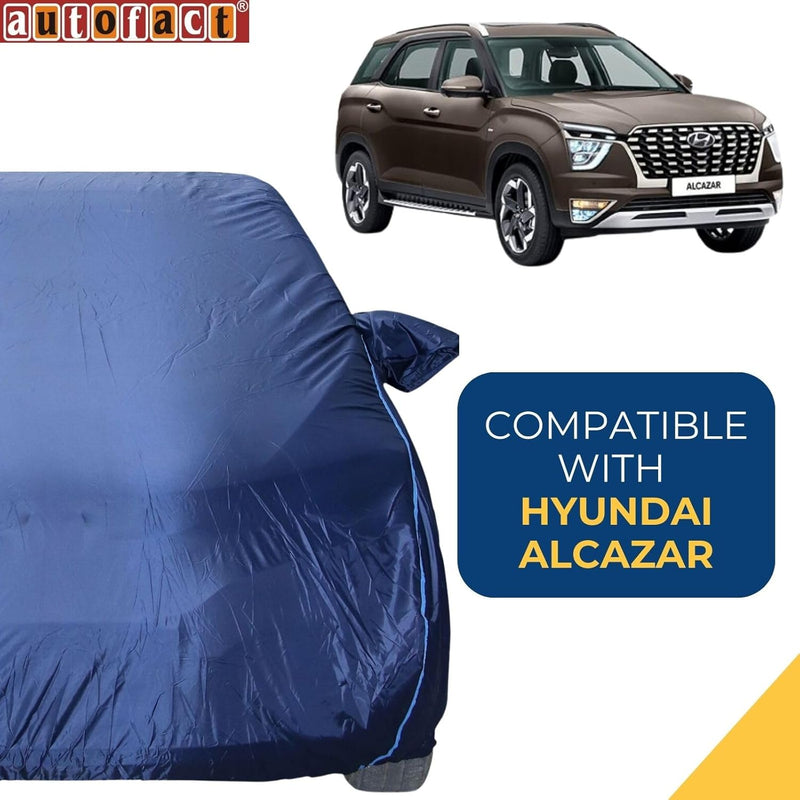 Autofact Alcazar Car Cover - CoreProtect - Water Resistant Car Body Cover for Hyundai Alcazar - With Mirror Pockets, Triple Stitched, Bottom Fully Elastic, Adjustable Belt and Buckle (Navy 210D)