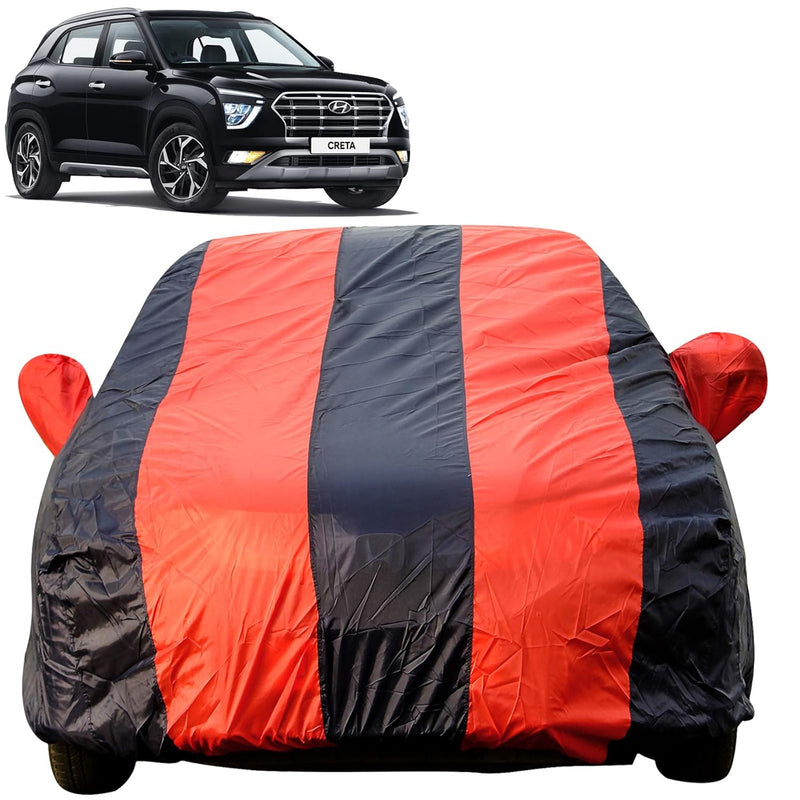 Autofact Creta New Car Cover - EasyShield - Waterproof Car Body Cover for Hyundai Creta New - With Mirror Pockets, Triple Stitched, Bottom Fully Elastic, Adjustable Belt and Buckle (Red Blue Stripes)